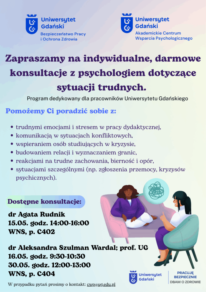 Spotkania odbędą się na Wydziale Nauk Społecznych i będą prowadzone przez dr Agatę Rudnik oraz dr Aleksandrę Szulman-Wardal, prof. UG. Podczas tych konsultacji będą Państwo mieli możliwość uzyskania profesjonalnej pomocy i porad w radzeniu sobie z trudnymi sytuacjami życiowymi.